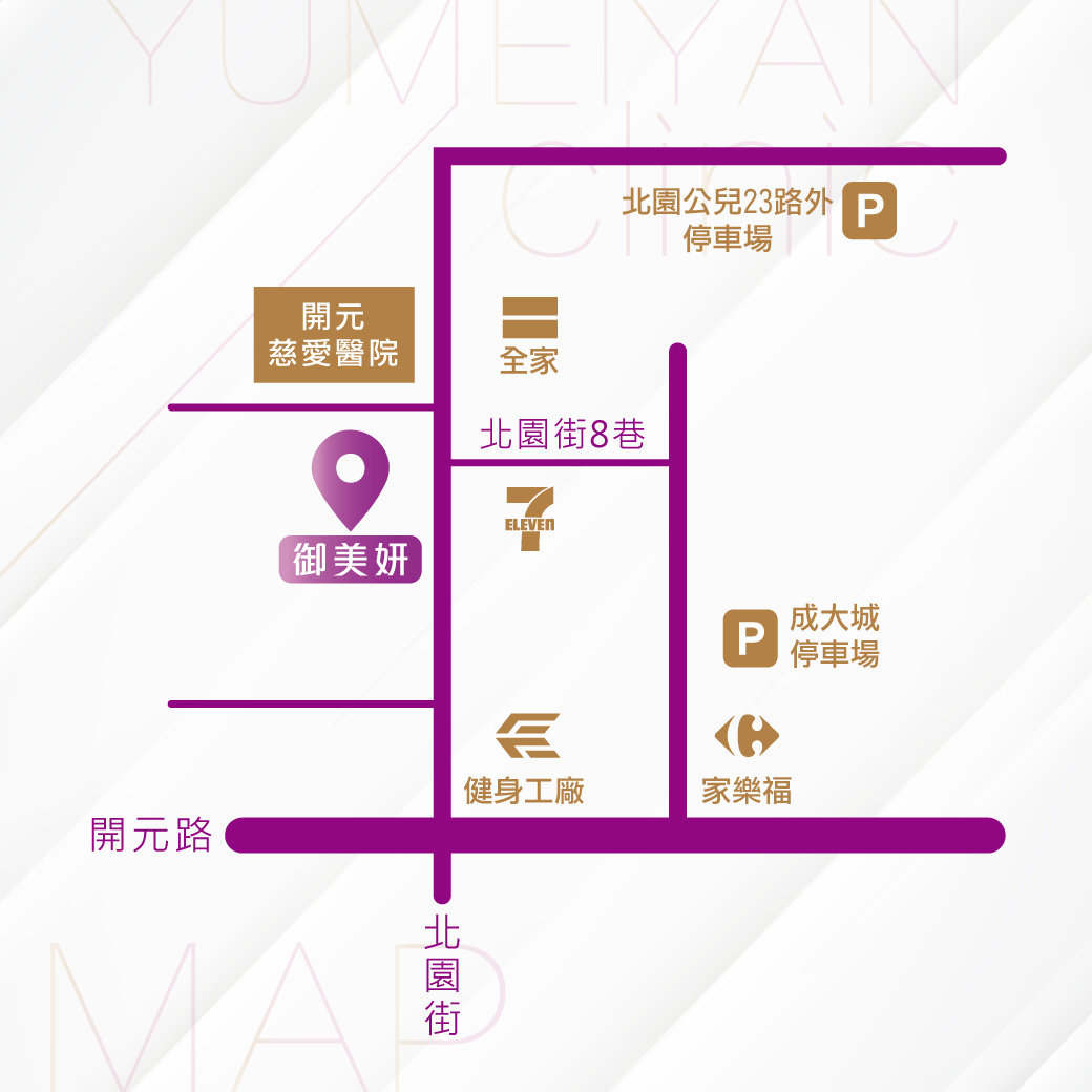 台南市安平區華平路132-2號台南火車站(前站)→轉乘計程車→約 20 分鐘車程抵達御美妍診所